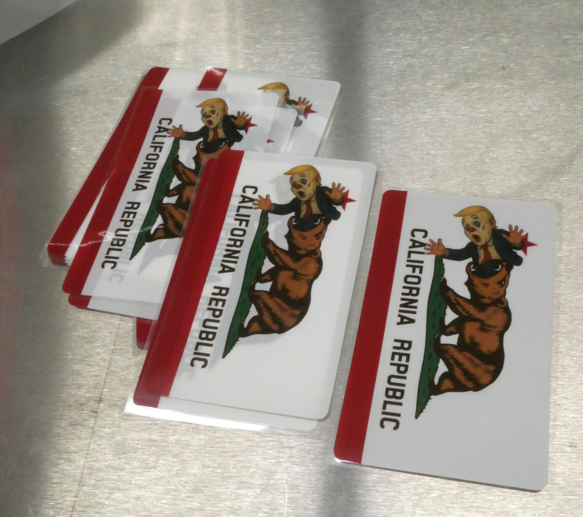 Printed on semi-transparent plastic adhesive label material and laminated. 4"x3" rounded corner rectangle.