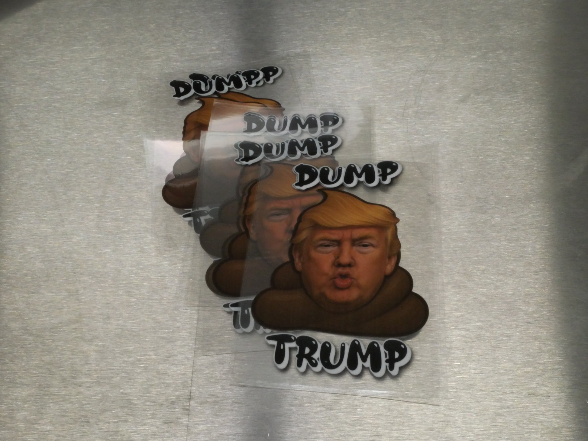 Printed on clear adhesive label material and laminated. 4"x3" rounded corner rectangle.