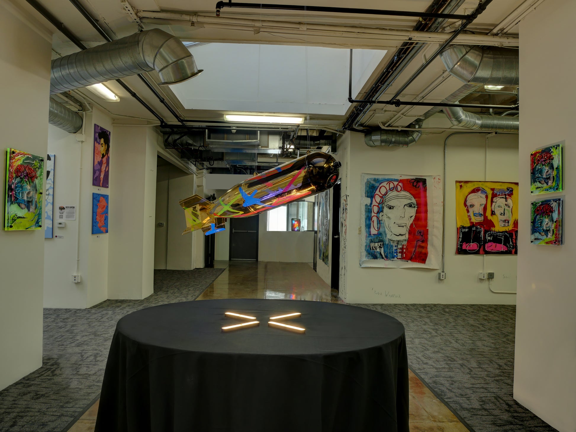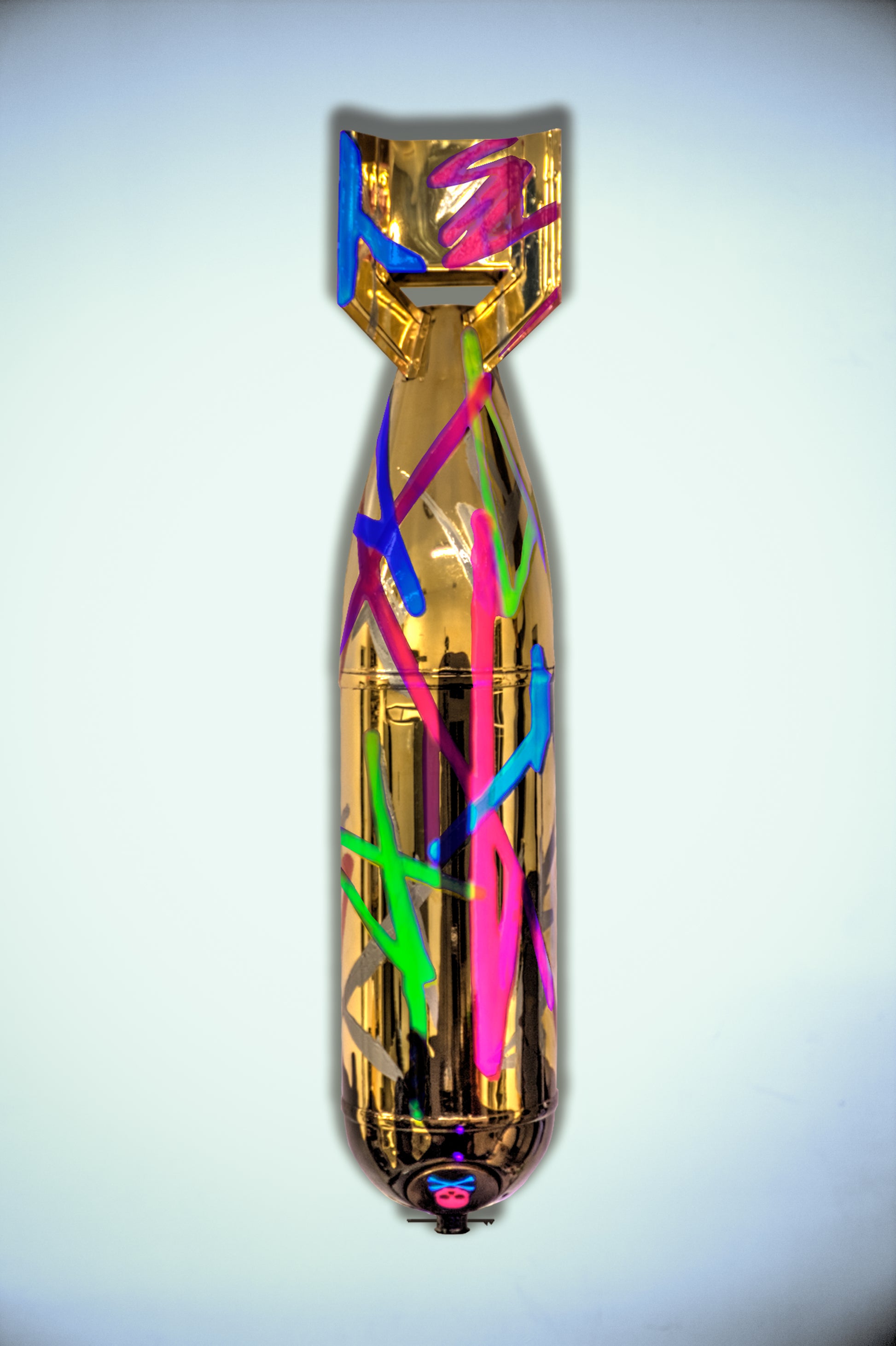 A symbol of life's reoccurring explosions that occur when the dark and bright realities of life collide. 24kt gold plated inert bombshell from the Vietnam War, fluorescent paint. Can be wall hung as seen in primary photo by its two hooks on backside or ceiling hung.