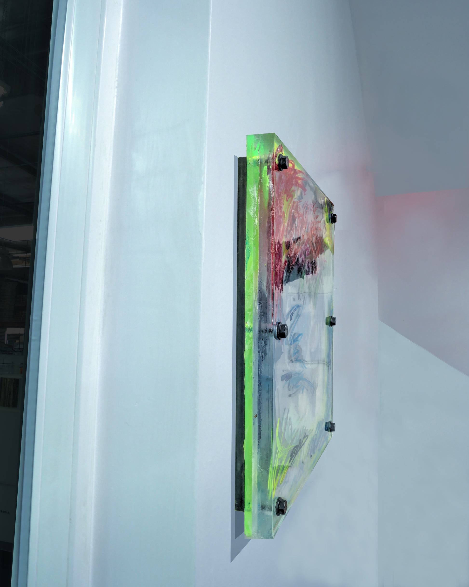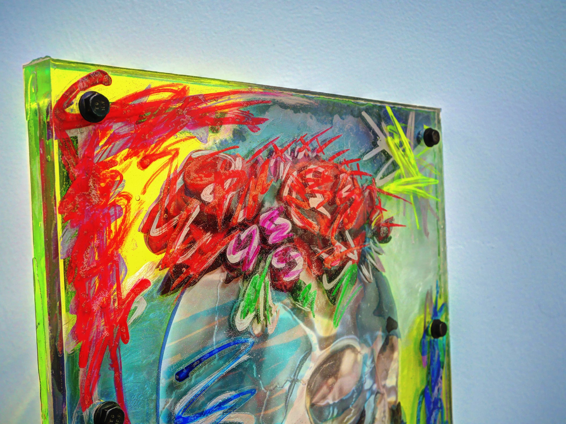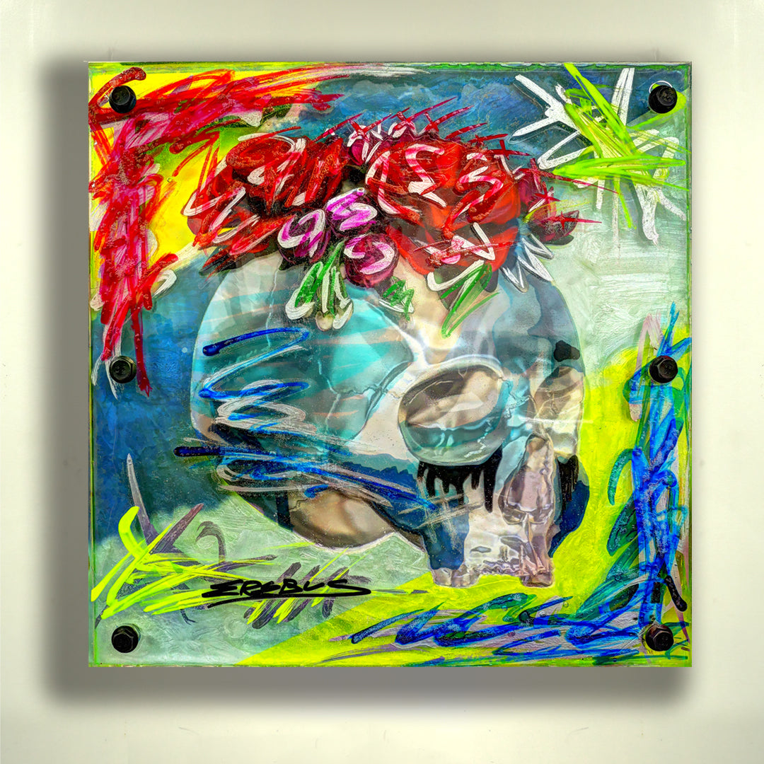 This wall hung painting is a 7 layered mixed medium piece comprising of a pearlescent print of a 3D modeled Floral Skull, film color print, and hand painted silver and color accents, all fused together with resin infill. Steel frame with black patina and wax. Flange bolts.